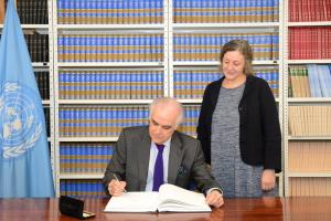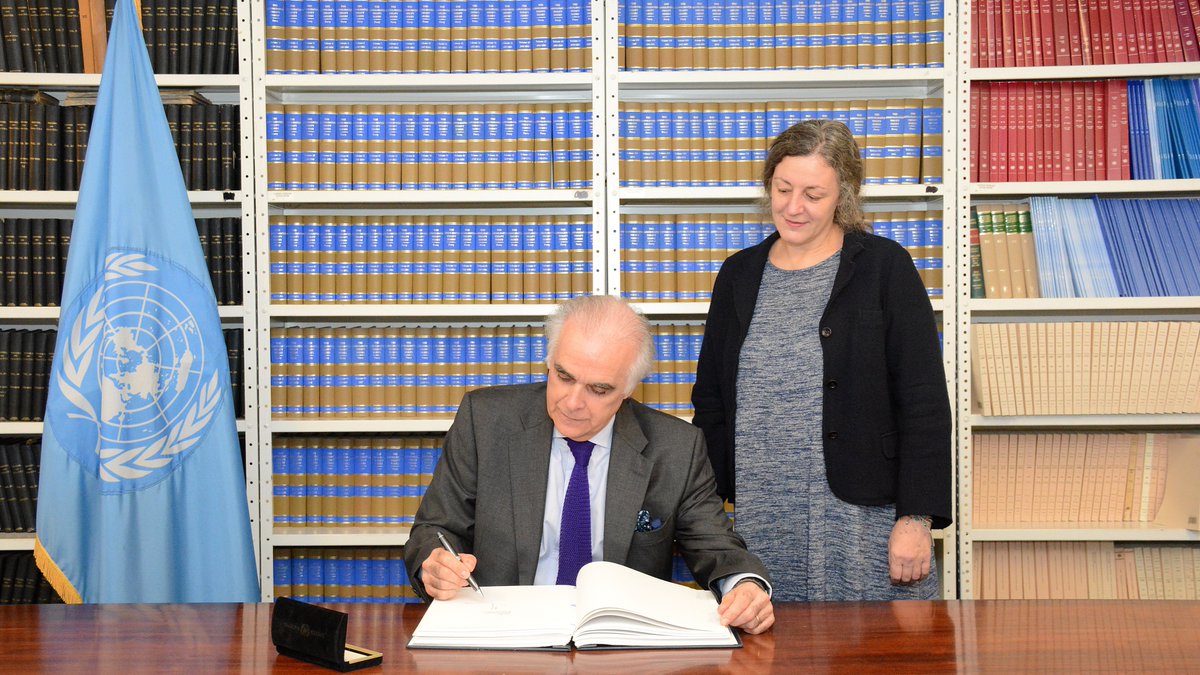 Embajador García Moritán, firma Acuerdo Internacional sobre el Aceite de Oliva y las Aceitunas de Mesa. Oficial ONU: Sra. Arancha Hinojal